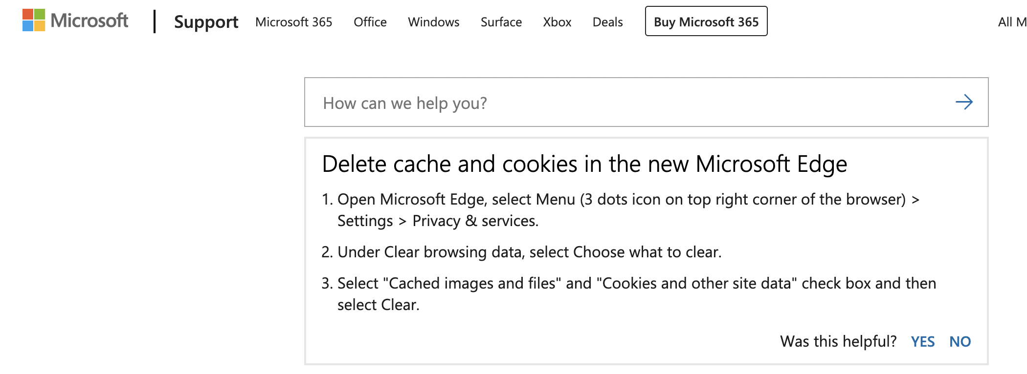 Microsoft Edge - https://support.microsoft.com/en-us/search?query=edge%20clear%20cookies%20and%20cache
