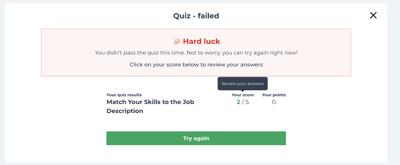 Retake Quiz: If you didn't achieve the expected results, don't worry! You can retake the Quiz to reinforce your knowledge and improve your performance. Please note that there are max 15 minutes of cooldown.