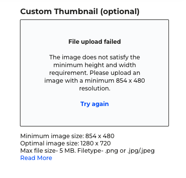 If the file does not meet the criteria, you might see the error below. Please ensure the image you use meets all the size and type criteria.