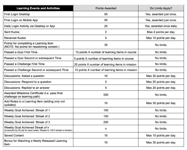 Points may be earned through the natural flow of your learning. For example, completing a Learning Item, Quiz, or Challenge will accumulate Learning Points. Points earned from learning enable you to build progress towards reaching your next Level.
